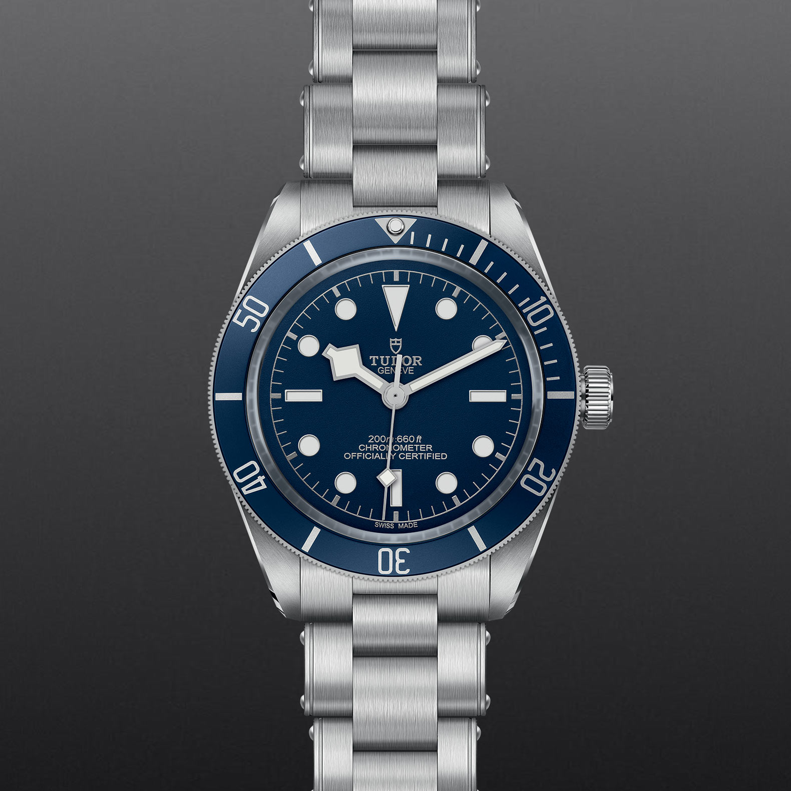 Steel screw-down winding crown, with the TUDOR rose in relief, with circular satin-brushed steel winding crown tube