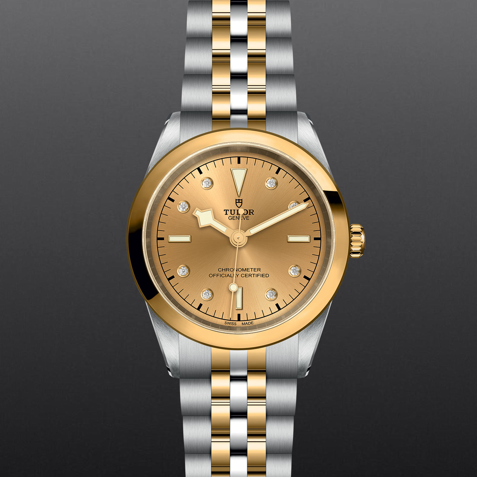 Screw-down winding crown with the TUDOR rose in relief. Steel covered by a 0.1mm 18 ct yellow gold cap