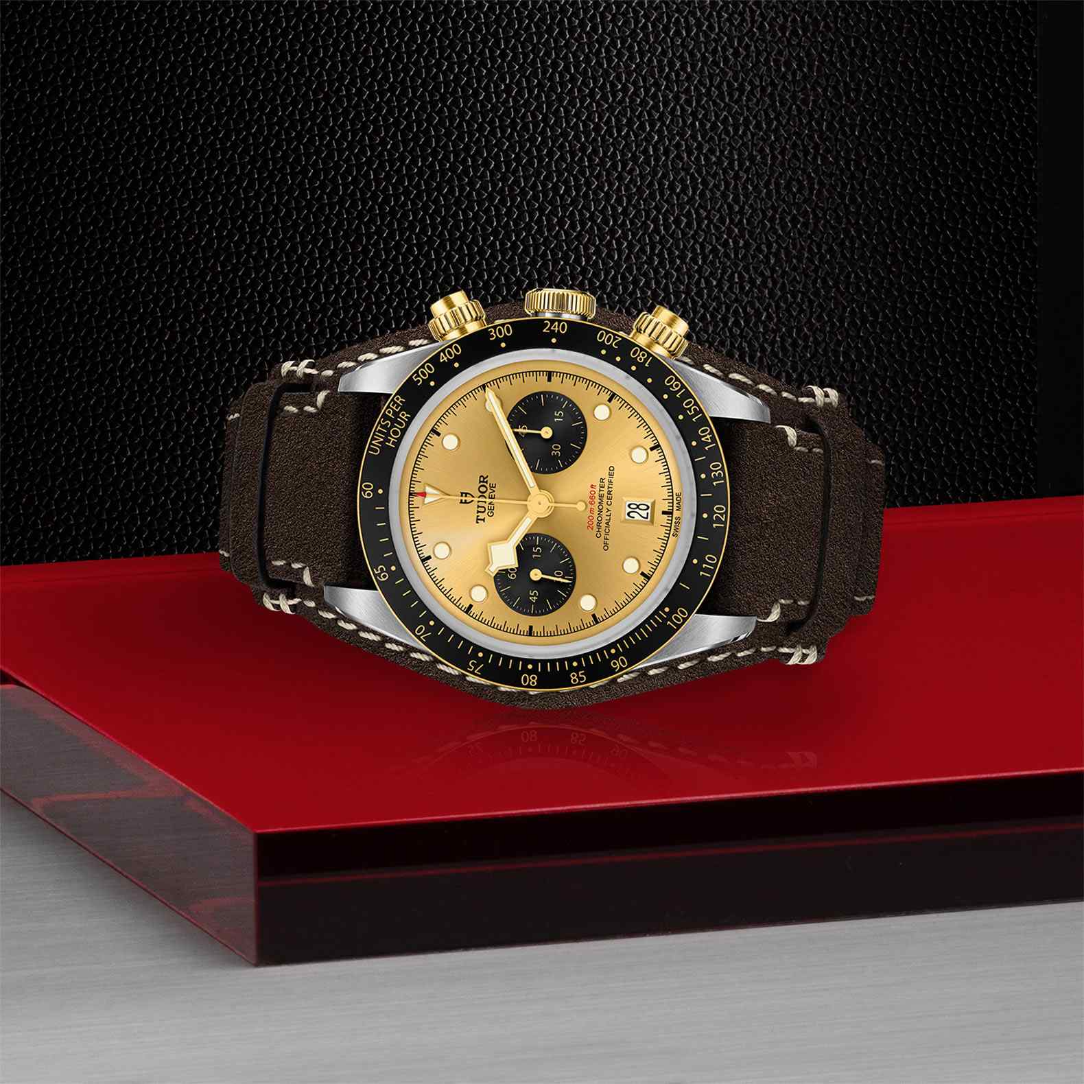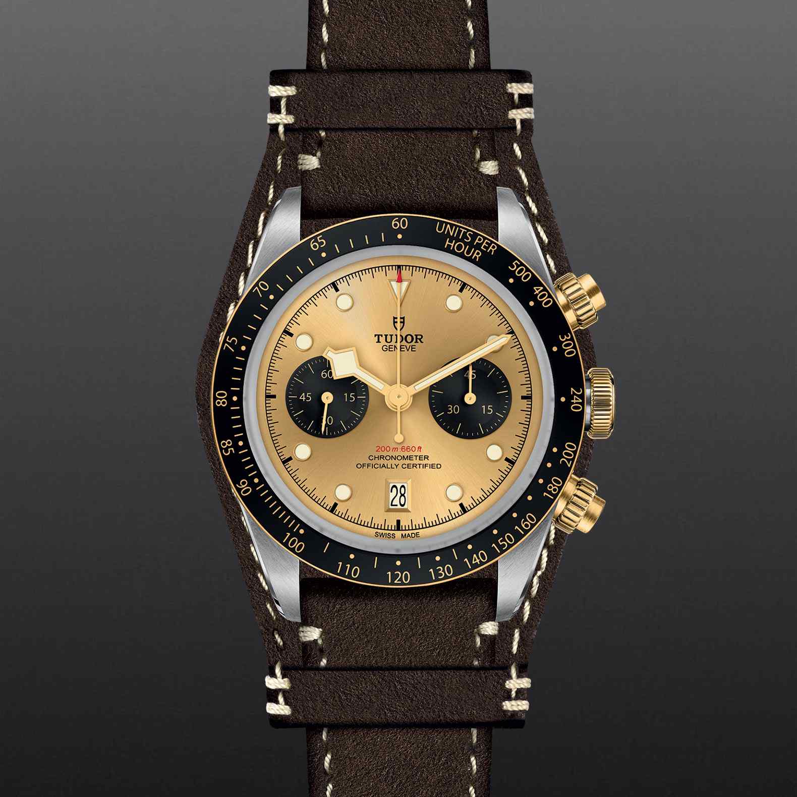 混合型Black Bay Chrono将Black Bay系列代表的潜水表传统与赛车计时表的精髓相结合。钢表壳保留了Black Bay系列的显著特征,其按钮的设计灵感则源于第一代帝舵计时腕表。圆纹磨砂钢固定外圈刻有测速计刻度,使这款运动型计时腕表的外观更趋完备。