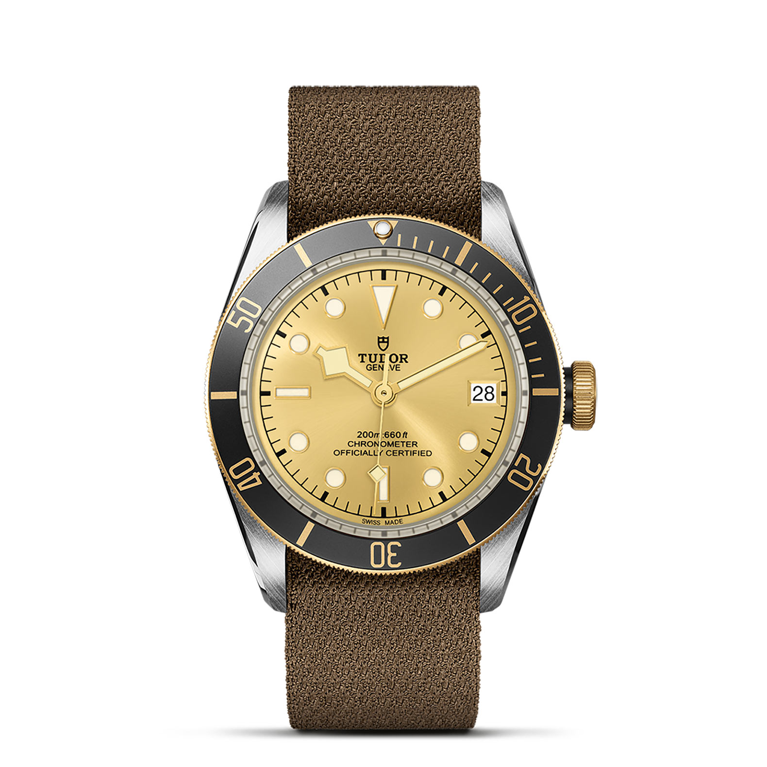 旋入式上链表冠,刻有帝舵表玫瑰标志,黑色漆面,配黑色阳极氧化铝上链表冠轴;精钢覆有0.3毫米18K黄金薄层