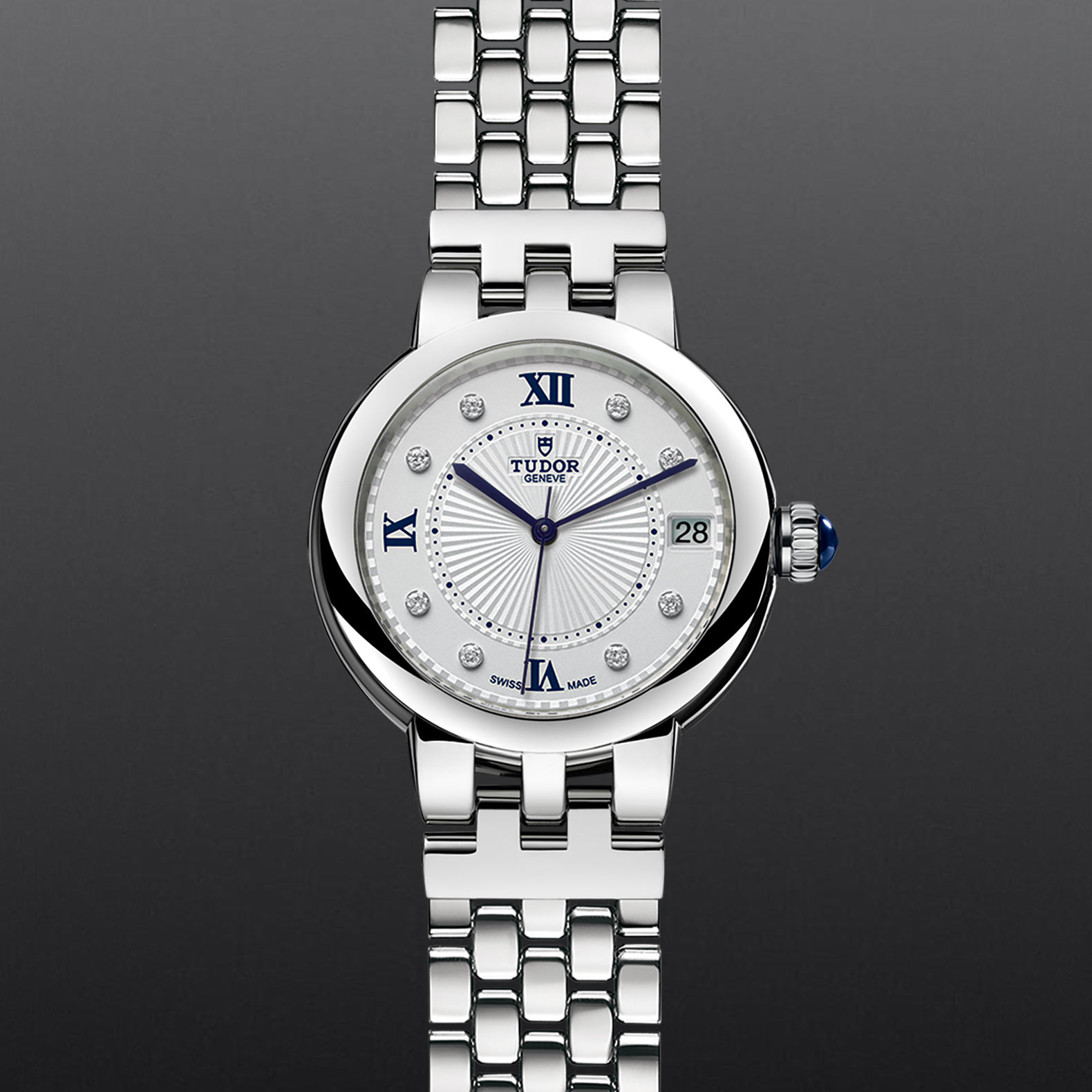 Clair de Rose系列重新演绎,秉承古典优雅及永恒经典的精神,善用品牌名垂青史的美学特色。Clair de Rose系列仅以不锈钢制成,备有六种配置和三种不同尺寸,表壳直径分别为26、30及34毫米,蛋白色表面饰有精美的浮雕图案,以蓝色漆面罗马数字或钻石作为钟点标记。