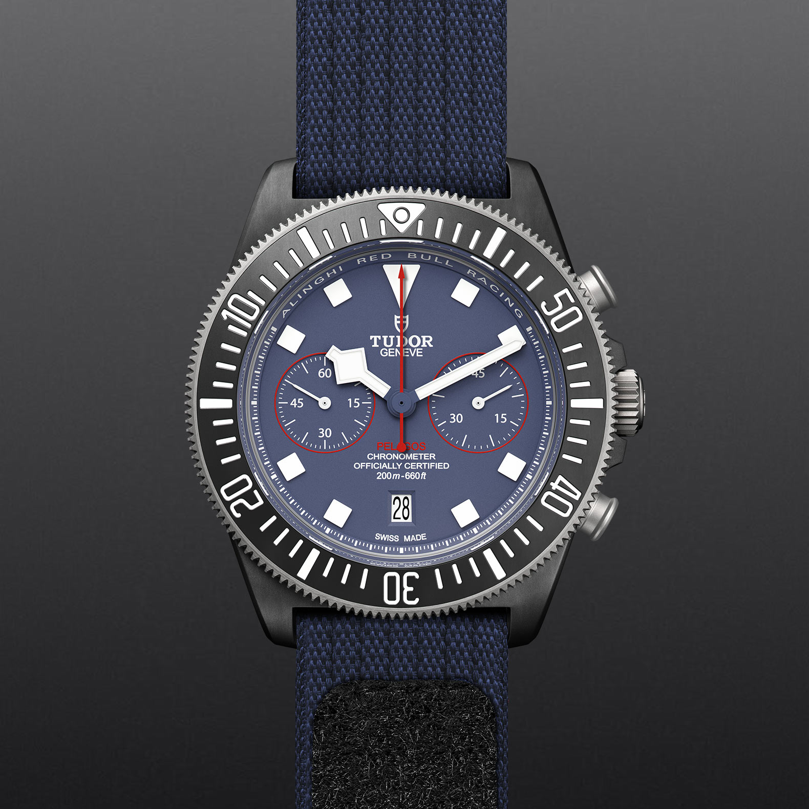 43毫米黑色碳复合材质表壳,哑光饰面,表壳底盖刻有阿灵基红牛帆船队标志